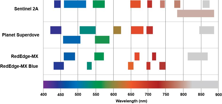 The image below (adapted from MicaSense n.d, p.3) shows a comparison of the bandwidths of all three data sources, excluding SWIR bands.