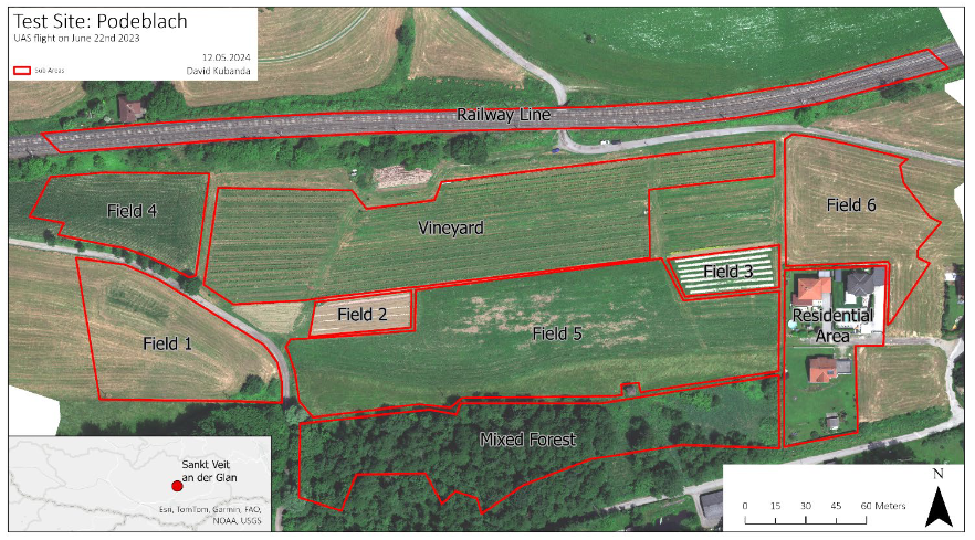 The selected test site in Podeblach was divided into 10 sub-areas of interest for the scope of this project (e.g. Residential area, Vineyard, Mixed Forest, and different types of fields), as can be seen in the image below.